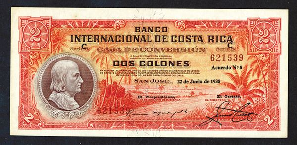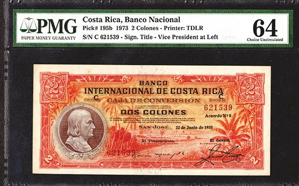 Costa Rica. 2 Colones. P-195b. Columbus at left end. Overprint on back over Banco Internacional de Costa Rica issue. Graded PMG Choice Uncirculated 64.