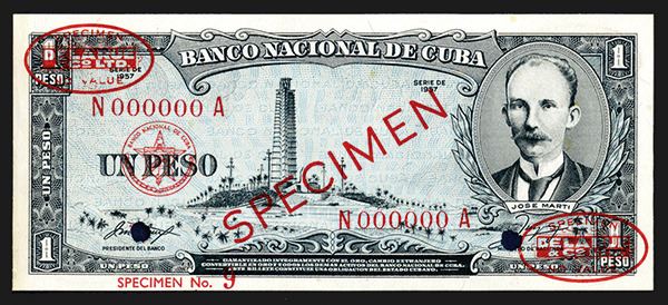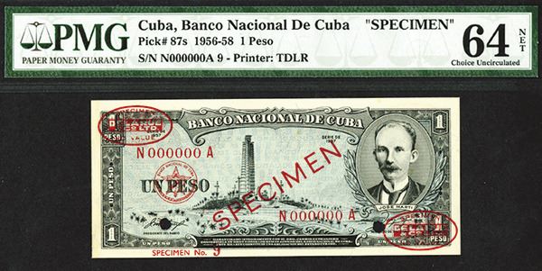 Cuba. Marti at right, monument at center. Pick #87b for type, Unlisted in this form. DeLaRue oval stamps in corner, number at lower left. Punch hole canceled on signatures. Back right with paper tone from old mounting. PMG graded Choice Uncirculated 64 NET with note of previously mounted.