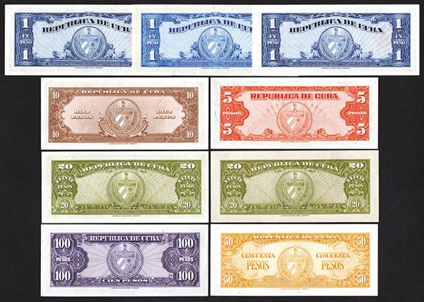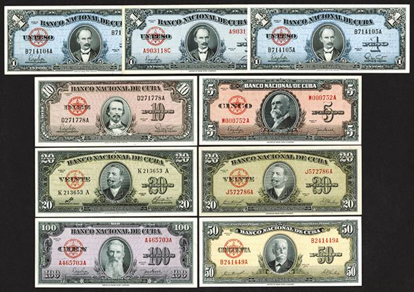 Cuba. 1, 5, 10, 50, 100 Pesos. P-77a, b (2); 78b (Low serial # W000752A); 79b; 80a, b; 81b; 82a. All very Choice Uncirculated. 9 pieces. (Arthur C. Matz Collection)