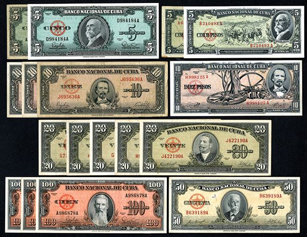 Banco Nacional de Cuba, 1949-60, Group of 17 Issued Notes Cuba, lot of 17, includes 5 Pesos (1958, 1960); 10 Pesos (1949, 1960 P-79 and P-88); 20 Pesos (1958, 5 pcs); 50 Pesos (1958); and 100 Pesos (1959). ABNC.