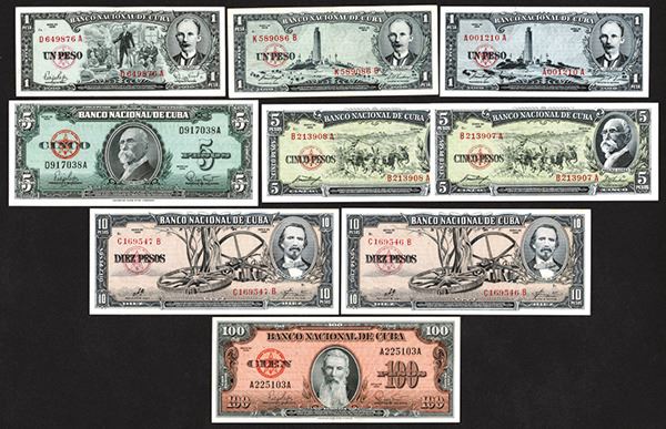 Cuba. 1, 5, 10, 100 Pesos. P-87a (Low serial # A001210A) c; 88c (2), 90; 91a (2); 92; 93a. The 87c is EF with an edge knock; Others Choice Very Fine. 9 pieces. (Arthur C. Matz Collection)