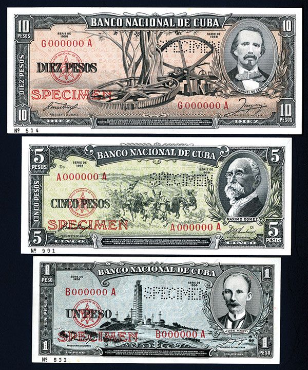 Cuba, set of 3 specimen notes, includes 1 Peso, 1956, P-87s1; 5 Pesos, 1958, P-91s1; and 10 Pesos, 1958, P-88s2. All crisp UNC.
