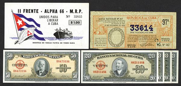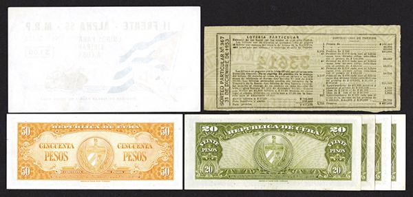 Cuba. 20, 50 Pesos. SCWPM 80c (4), 81b. All Uncirculated but for one 20 Peso. Also includes a 1953 lottery ticket as well as a Cuba Liberation cause receipt. 7 pieces.