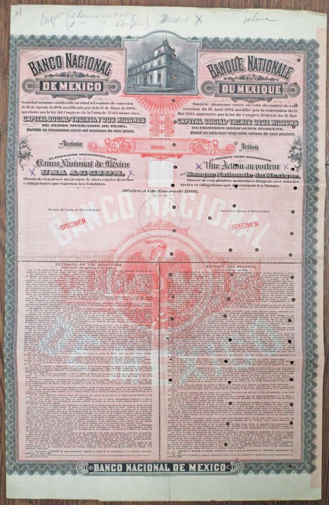 Mexico, 1906. Specimen Share Certificate in Spanish and French, Black text with black border and light red background with coat of arms of Mexico at center. Specimen overprints, 00000 serial number, and POCs. VF condition with some signs of wear. Also includes edits made in ink possibly during design process. ABNC.