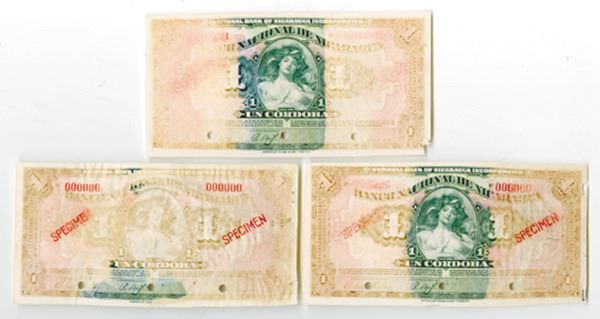 Nicaragua. Set of three specimen 1 Cordoba, 1927, P-62s1. The three notes are unevenly faded. Also included is an original contemporary envelope with the annotations "BANCO NACIONIAL DE NICARAGUA" and "F 8697 . (3) notes experimented with by Mr. J. Ford". Clearly used for experimental purposes at the National Bank, thus quite unusual. F-VF. ABNC. Rare security department samples for ink testing. All 3 were stapled on the right front border and have small holes or small tears due to removal. All are rare notes unique in this format.