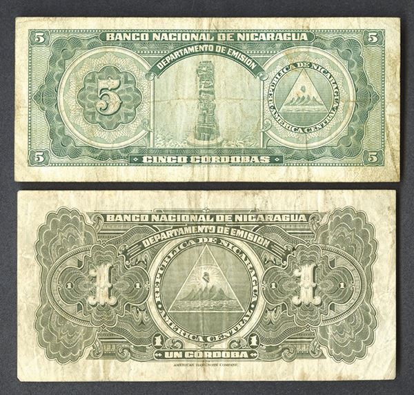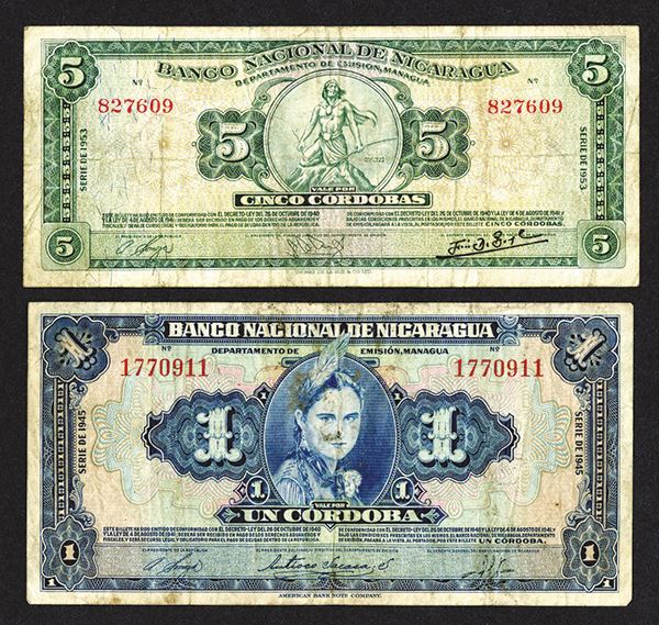 Nicaragua. 1 Cordoba. 1945. SCWPM 90b; 5 Cordobas SCWPM 100a. Both Very Good, dirty.
