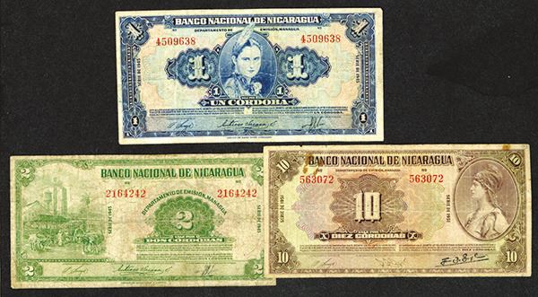 Nicaragua. 1, 2, 10 Cordobas. P-90b; 92b; 94c. Fine, the last with a stain on the front and rust on the back. 3 pieces.