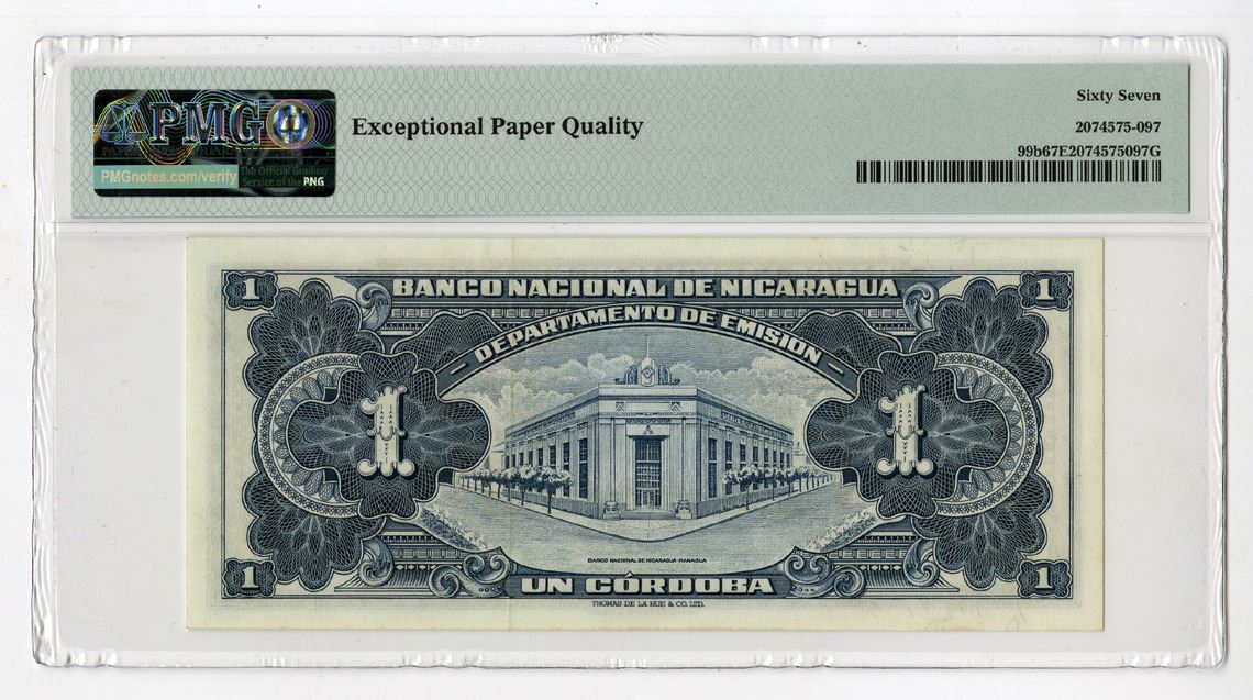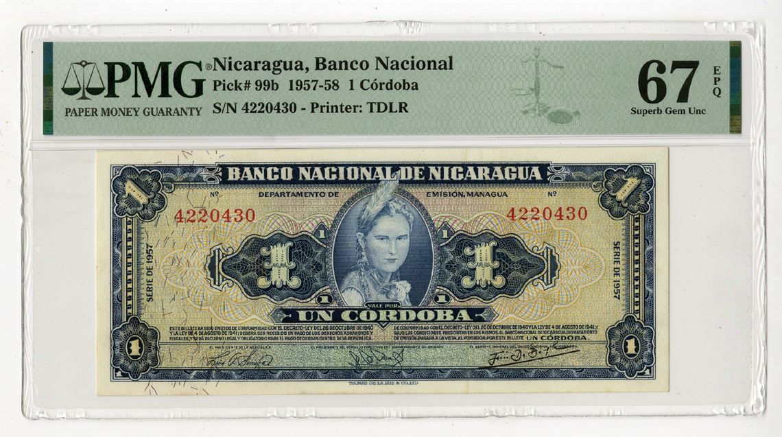 Nicaragua, 1957. 1 Cordoba, P-99b, Issued Banknote, Blue on m/c underprint with woman in national costume at center, Back is blue with bank building at center, S/N 4220430, PMG graded Superb Gem Uncirculated 67 EPQ, TDLR. This is the highest graded example out of 19 graded in the PMG census for this variety.