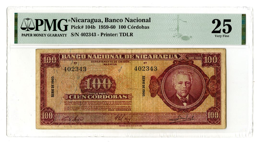 Nicaragua, 1960. 100 Cordobas, P-104b, Issued Banknote. Purple on m/c underprint with portrait of J. Dolores Estrada at right. S/N 402343 Printer: TDLR. PMG graded Very Fine 25.