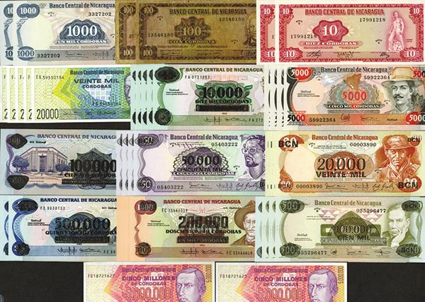 Nicaragua. 10, 100, 1000, 5000, 10000, 20000, 50000, 100000, 200000, 500000, 5000000 Cordobas. P-123 (2); 132 (2 VG); 143; 145a; 146 (3); 147 (4); 148 (4); 149 (4); 157; 158 (5); 159; 160 (5); 162 (7); 163 (2); 165 (2). All Choice Uncirculated except where noted. 44 pieces.