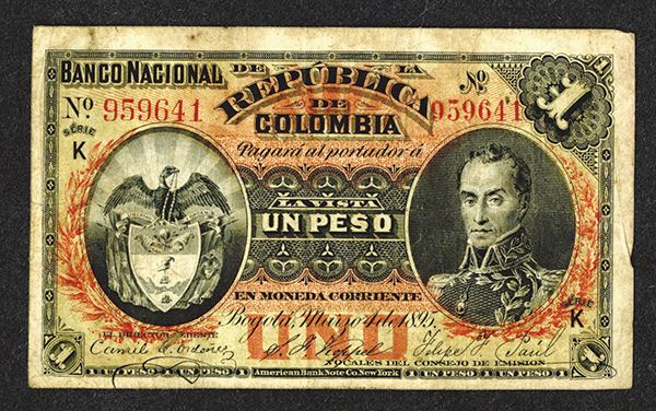 Colombia. Banco Nacional de Republica de Colombia. 1895 Issue. 1 Peso. 4.3.1895. Fine, dirty.