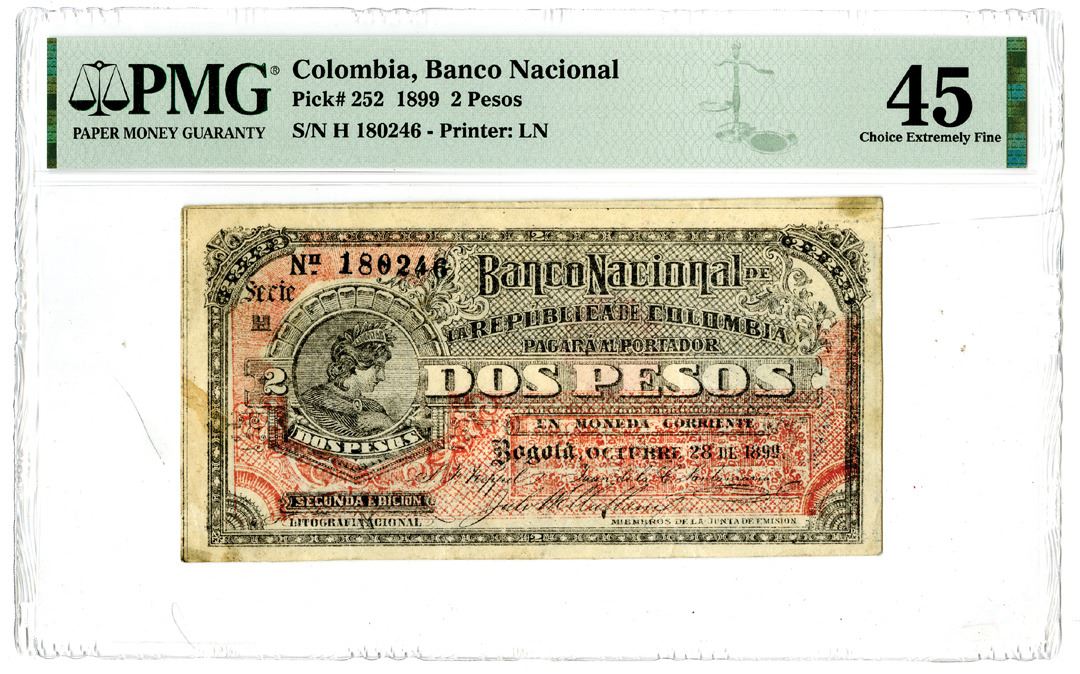 Colombia. 1899. 2 Pesos, P-252, Issued banknote, Gray on red underprint, S/N H 180246, PMG graded Choice Extremely Fine 45 with comment "Stains". Printer: LN.