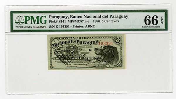 Paraguay. Issued 5 Centavos, 1886, P-S141, MP#MC87.a-e. PMG graded Gem Unc 66 EPQ. ABNC. Tied with one other note for finest known.