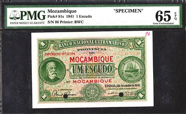 Mozambique. 1 Escudo. P-81s. Chamico at left, ship seal at right. POCs with hand number at top right margin. PMG Gem Uncirculated 65 EPQ.