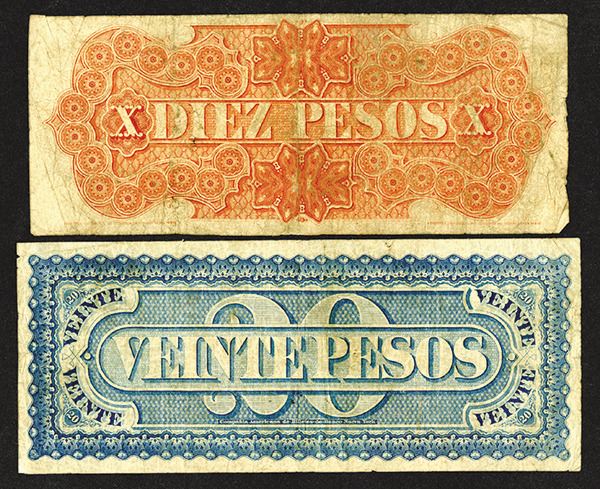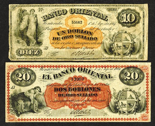 Uruguay. 10, 20 Doblones. P-S385a, S386. Issued notes, colorful back. ABNC. Fine-Very Fine. 2 pieces.