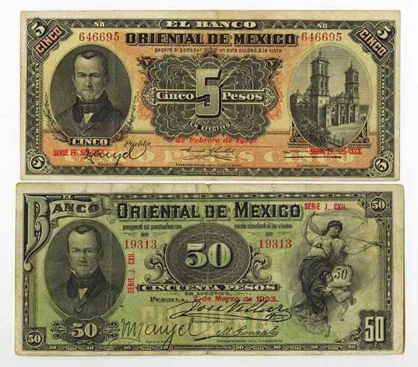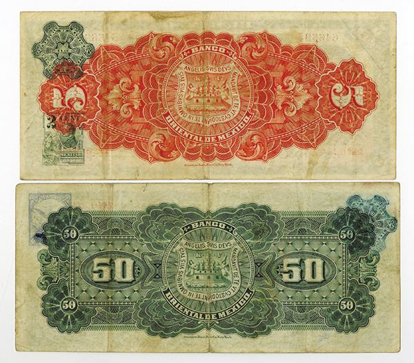 Puebla, Mexico. Lot of 2 notes, Includes1914, 5 Pesos, P-S381c, and 1903, 50 Pesos, P-S384b, Issued, VF condition. ABNC.