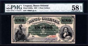 Montevideo, 1867. 1 Peso, Ser. A, P-S383a, Issued Banknote, Black on green underprint with woman at right and Gaucho on left, back blank. The note is PMG graded "58 EPQ" Choice About Uncirculated, Exceptional Paper Quality. Minimal handling issues keep this note from a full Unc. Amazing and fresh appearing note that is rarely found issued in any grade and this one appears crisp and as close to Unc. as you can get. It is only priced in Fine in the SCWPM. ABNC.