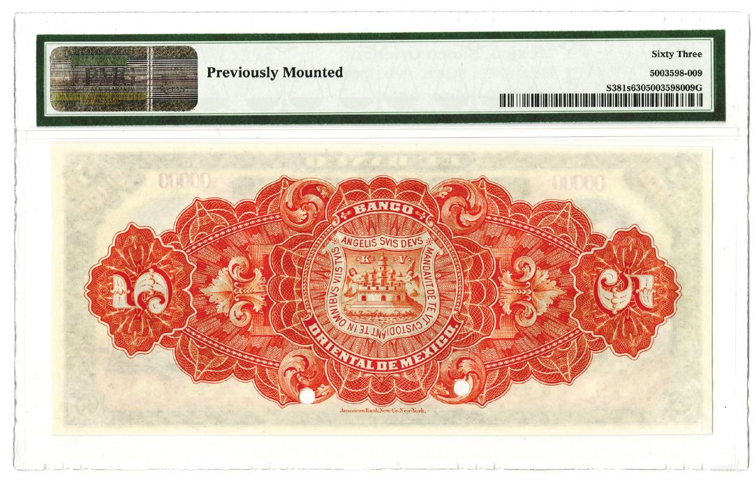 Mexico. ND (1900-1914). 5 Pesos, P-S381s, M460s, specimen banknote, s/n 00000, overprinted "SPECIMEN", POCs, PMG Graded Choice Uncirculated 63 with comment "Previously Mounted", ABNC.