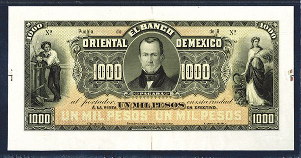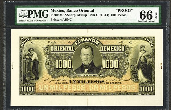 Mexico. Puebla. ca. 1901-14. P-S387p. 1000 Pesos. Highest denomination in series. Obverse proof mounted on card stock. Black on orange and yellow underprint. Sailor at left and portrait of Esteban de Antuano at center, while the left depicts an allegorical woman holding a scythe and a bundle of wheat. PMG graded Gem Uncirculated 66 EPQ. Very rare in any form. ABNC.