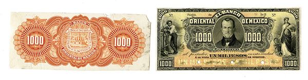 Mexico, includes front and back proofs of 1000 Pesos, P-S389. Obverse proof is punch holed in signature area, About Uncirculated otherwise, with some uneven edges; reverse proof has multiple tears and small pieces missing from the margin, Very Good as such. ABNC.