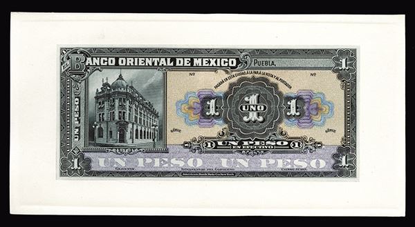 Mexico. 1 Peso. P-S379p. Bank Building at left end. Face proof with underprint on india paper trimmed to note size mounted to larger card. Pencil notation on back. ABNC. As made.