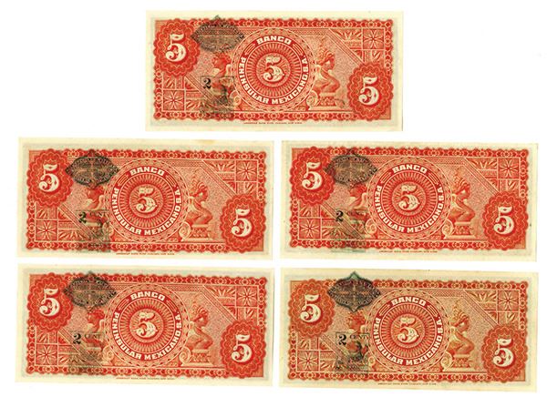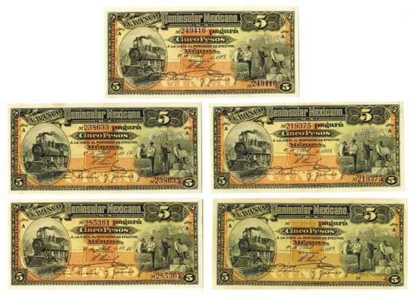 Mexico, Lot of 5 notes, all are 5 Pesos, P-S465a, Issued, Black on light yellow and orange, Mostly Choice to Gem Uncirculated condition with excellent centering, very light pencil notations that can be erased on the top right corners, ABNC.