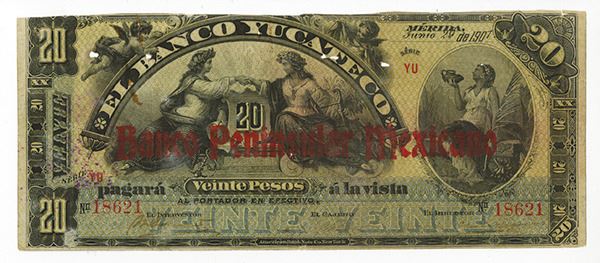 Merida, Mexico. 20 Pesos, Ser.YU, P-S460a, Issued banknote, overprinted on 20 Pesos, Banco Yucateco, Black on m/c, S/N 18621, VG condition with top cut close, 4 small worm holes and 2 small pin holes, still a scarce note in any condition, ABNC.