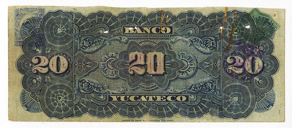 Merida, Mexico. 20 Pesos, Ser.YU, P-S460a, Issued banknote, overprinted on 20 Pesos, Banco Yucateco, Black on m/c, S/N 18621, VG condition with top cut close, 4 small worm holes and 2 small pin holes, still a scarce note in any condition, ABNC.