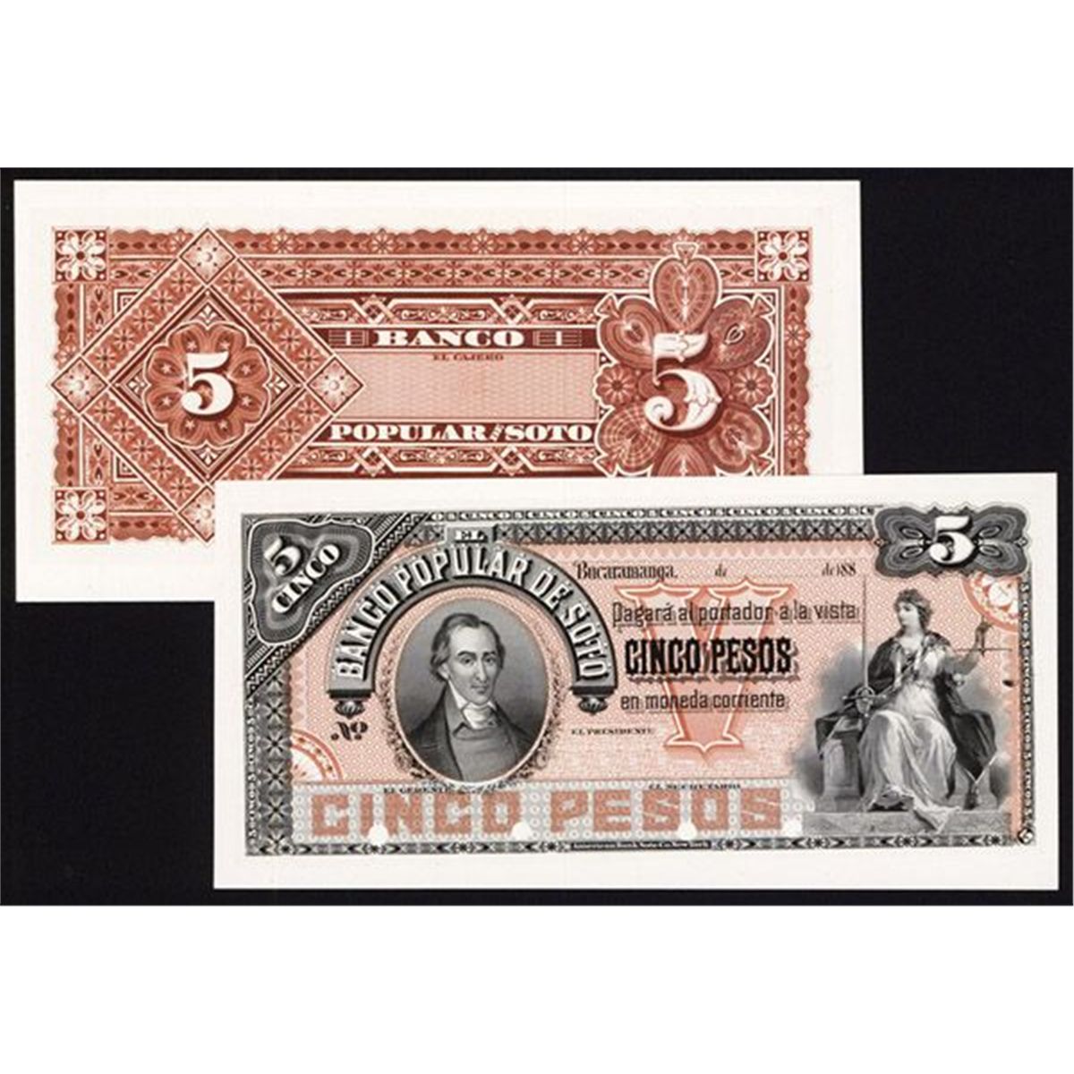 Bucaramanga, Colombia, 188x, 5 Pesos, P-S782p., Proof, Printed in black on red-brown on india on card, Seated Justice on left with portrait of man on left center, back red-brown. Gem Uncirculated, Rare private bank that is rarely seen. ABNC.
