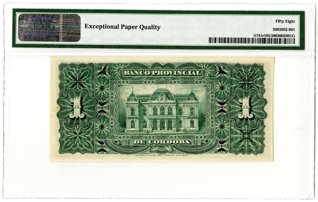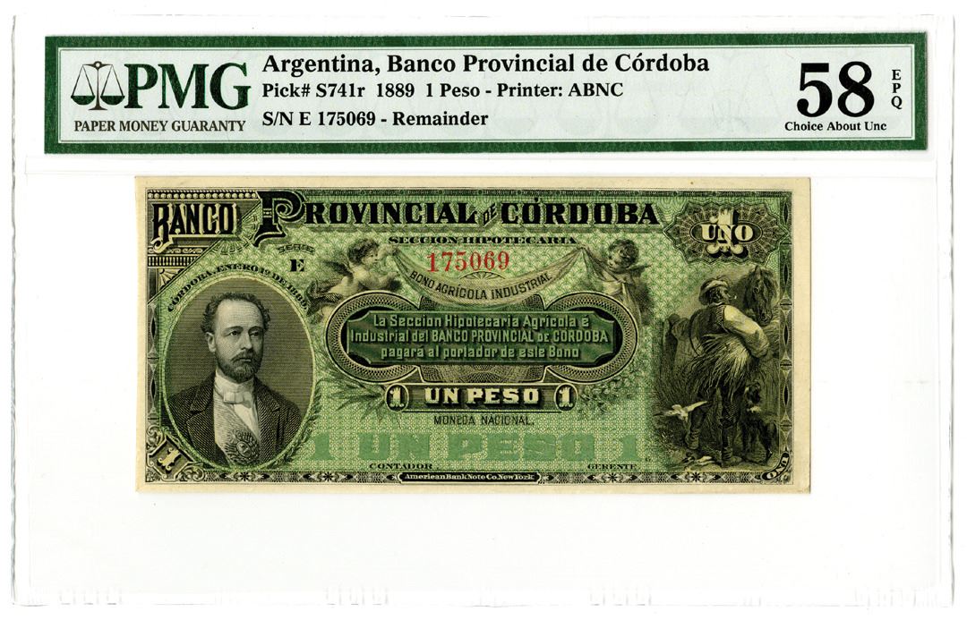 Argentina. 1 Peso, 1889, P-S741r. Remainder banknote, black on green underprint. Portrait of J. Cellman at lower left, cherubs at center, and farmer with horses at right. Back is green and shows building at center. PMG graded Choice About Uncirculated 58 EPQ. S/N E 175069. (Cert # 5003602-001). ABNC. Tied with one other note for highest graded out of 6 total. Scarce note in any grade.
