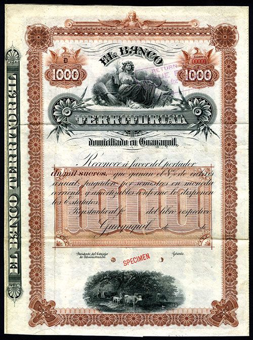 Ecuador, 19xx, 1000 Sucres, 8% Specimen Bond, Black on brown border and underprint, Woman top center holding wheat and sickle with beehive behind her, VF-XF condition, ABNC.