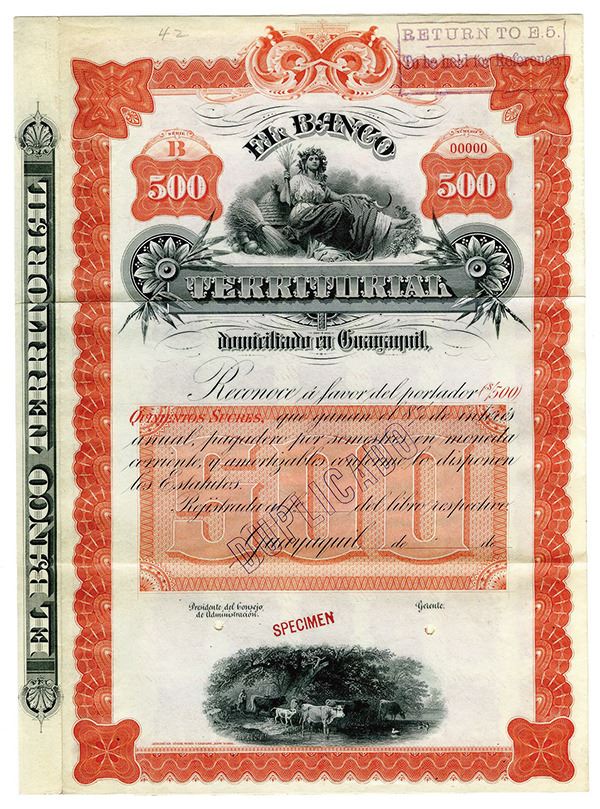 Ecuador. $500 Specimen 8% Series B Coupon Bond, Black print on red border and under tint printed in Spanish, Allegorical woman sitting at top, Specimen overprints and POC's, Fine condition with toning and splitting along fold lines, ABNC.