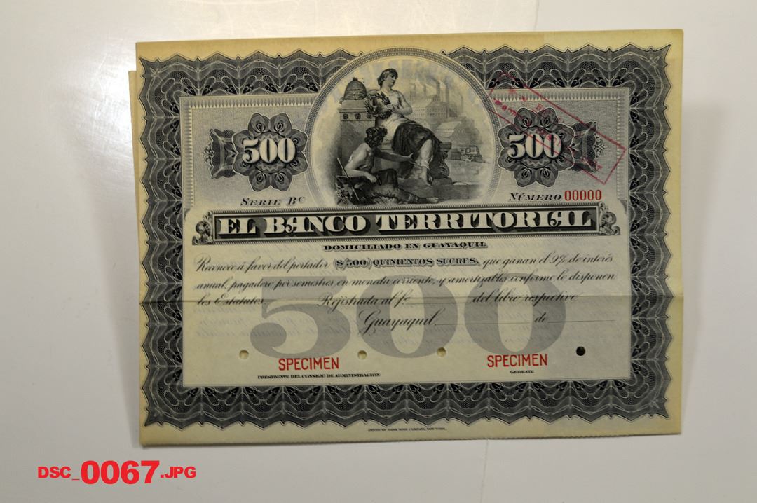 Guayaquil, Ecuador. $500 Specimen 9% Coupon Bond, Black print on steel gray border and under tint, Image of allegorical figures sitting together with a factory in the background, Specimen overprints and POC's, VF-XF condition, ABNC.