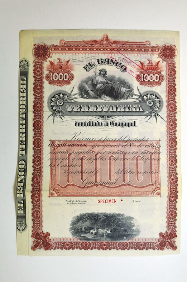 Ecuador. 1000 Sucres Specimen 8% Coupon Bond. Black ink with brown border and under print. Vignette of allegorical figure at top center of certificate. Specimen overprints, POC's, ABNC. Very Fine, edge tone.