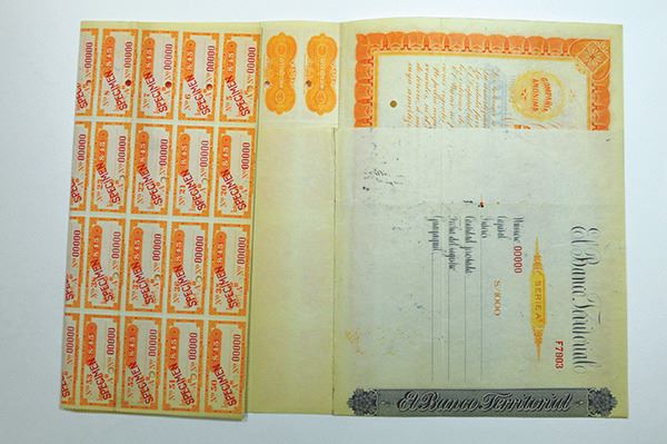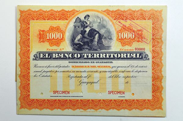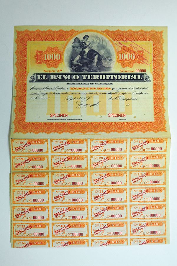 Ecuador. 1000 Sucres. Coupon Bond Specimen. Orange. Very Fine +.