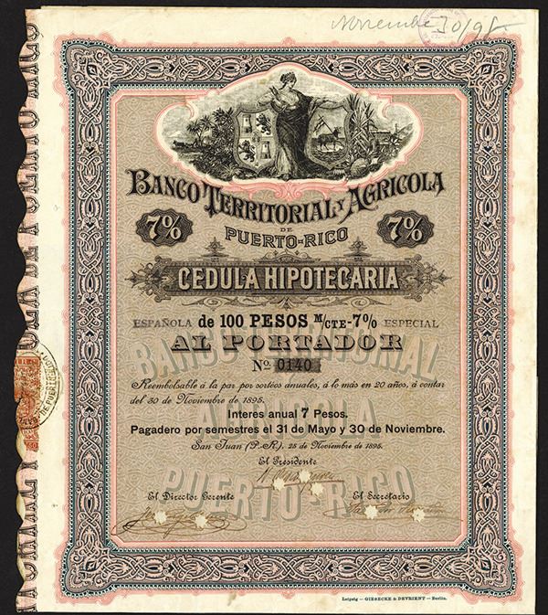 Puerto Rico. 100 Peso Coupon Bond. Giesecke & Devrient imprint. Revenue stamp on counterfoil cut. VF.