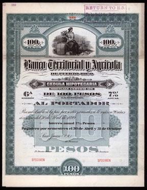1899, 100 Pesos. 7% mortgage certificate. Green border with allegorical female and ship vignette. ABNCo Litho specimen with coupons, VF