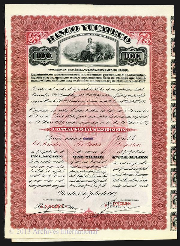 Merida, Mexico. 1907. 100 Pesos, Specimen bond. Red border and undertint. Vignette of allegorical seated woman and fruit. Coupons attached. Red specimen overprint. XF condition. ABNC. Rare bond.