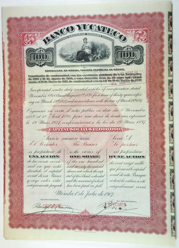 Merida, Mexico. 100 Pesos, Specimen bond. Red border and undertint. Vignette of allegorical seated woman and fruit. Coupons attached. Red specimen overprint. XF condition. ABNC. Rare bond.