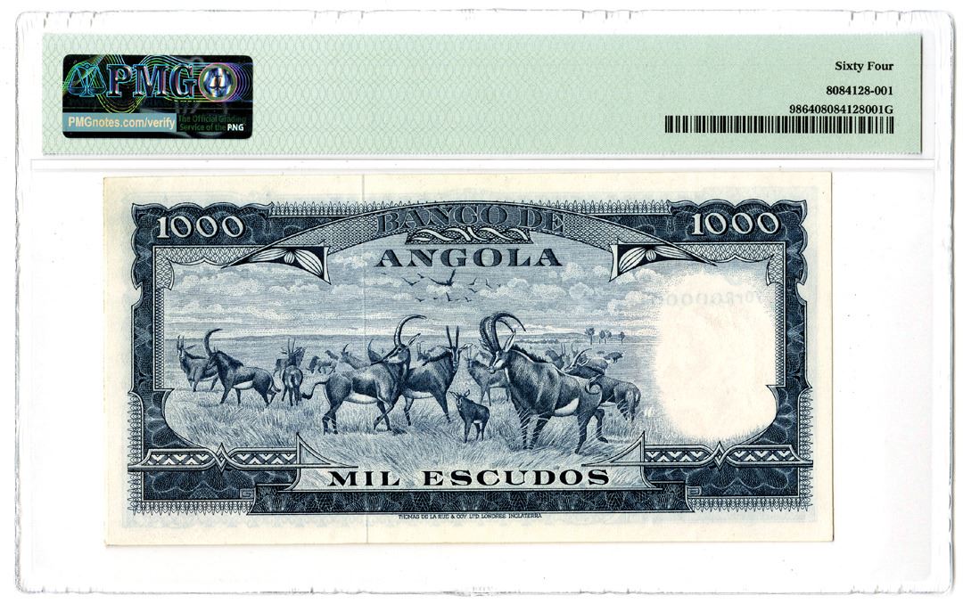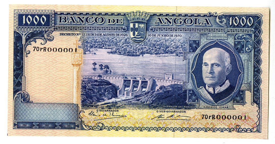 Angola 1970. 1000 Escudos, P-98, issued banknote, S/N 70RR000001 "Serial Number 1", PMG graded Choice Uncirculated 64, TDLR. (From the Allen Berk Collection)