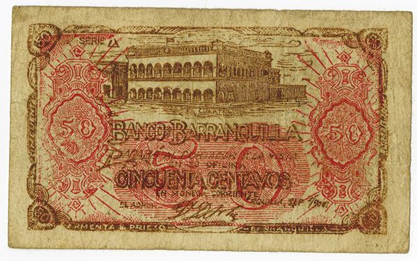 Barranquilla, Colombia, 50 Centavos, P-S244, Issued, Brown on light red underprint, back black on pink, Fine to Choice Fine condition, Rare note that is seldom seen at auction. ABNC.