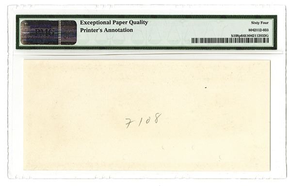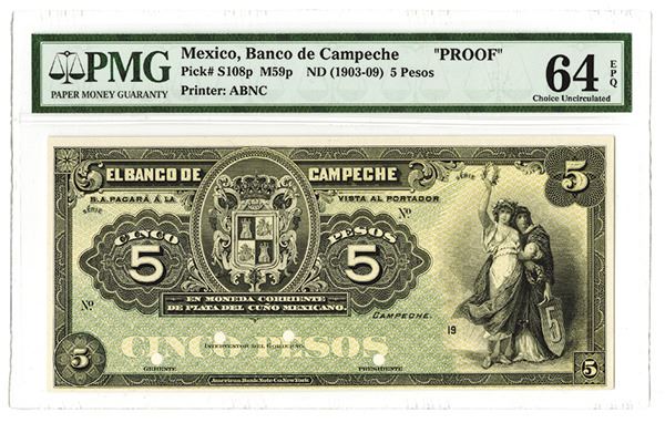 Mexico. 19--, ca.1903-1909. P-S108p. 5 Pesos. Proof banknote on card stock cut down to banknote size. Black on green underprint. State arms at left center, with two allegorical women at right. PMG graded Choice Uncirculated 64 EPQ, looks Gem. Extremely rare and attractive Mexican banknote. ABNC.