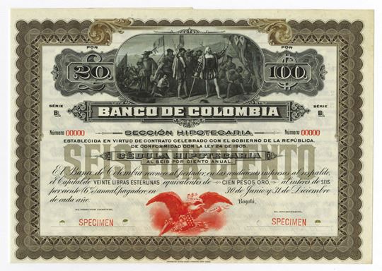 Colombia. $100 Specimen 6% Series B Gold Coupon Bond, Black print on brown border and under tint, Group of settlers at top claiming the land, Specimen overprints and POC's, VF-XF condition, ABNC.