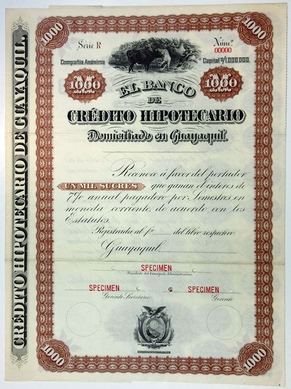 Ecuador, ND (1900-20s). 1000 Sucres 7% Coupon Bond in Spanish, Black text with brown border, Cattle at watering hole at top center. Red specimen overprints, 00000 serial number, and POCs. VF condition, ABNC.