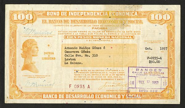 Cuba. 100 Pesos. P-NL. Liberty head at left end. Interest chart on back. VF, Paper rust, and stain.