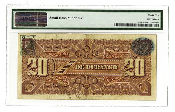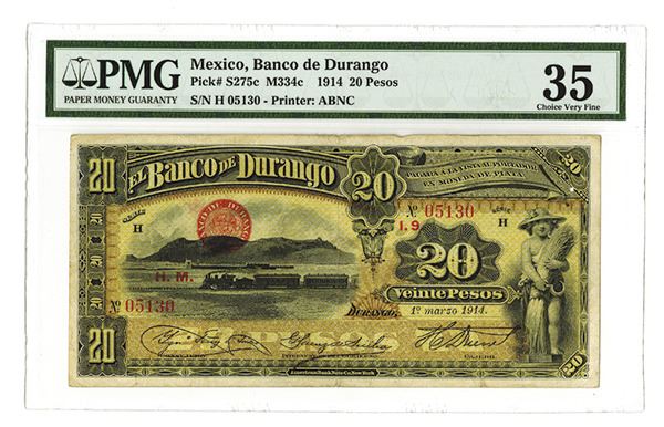 Mexico, issued 20 Pesos, 1914, P-S275c, M334c, graded Choice Very Fine 35 by PMG with a remark of "small hole, minor ink". ABNC.