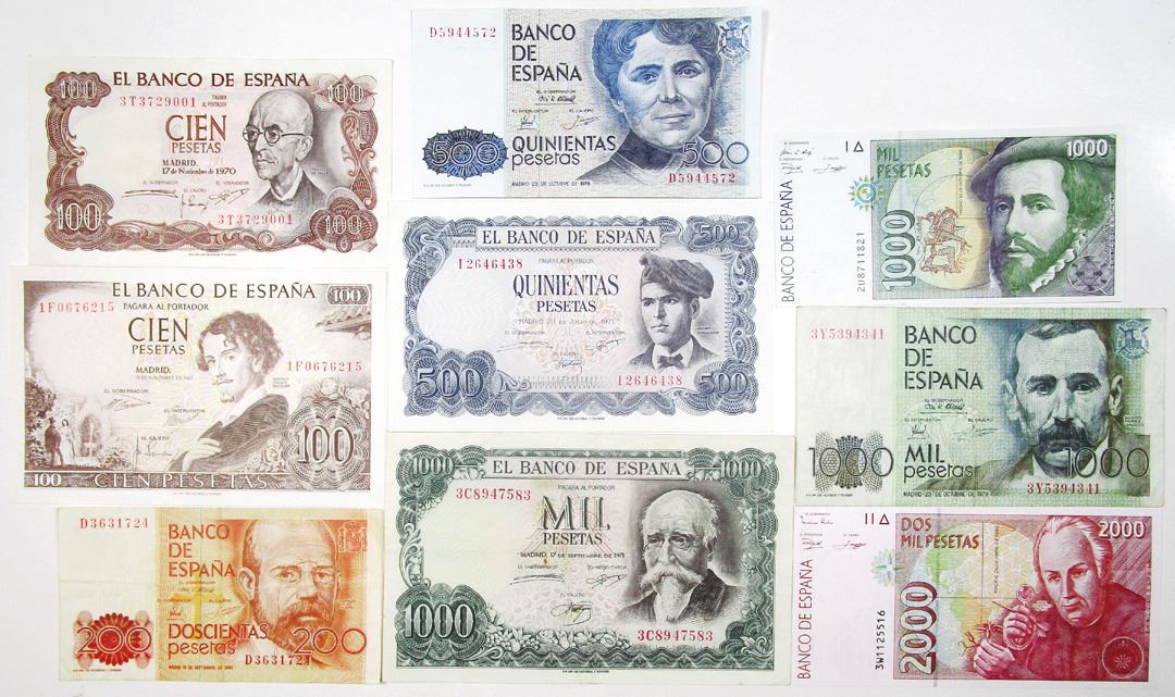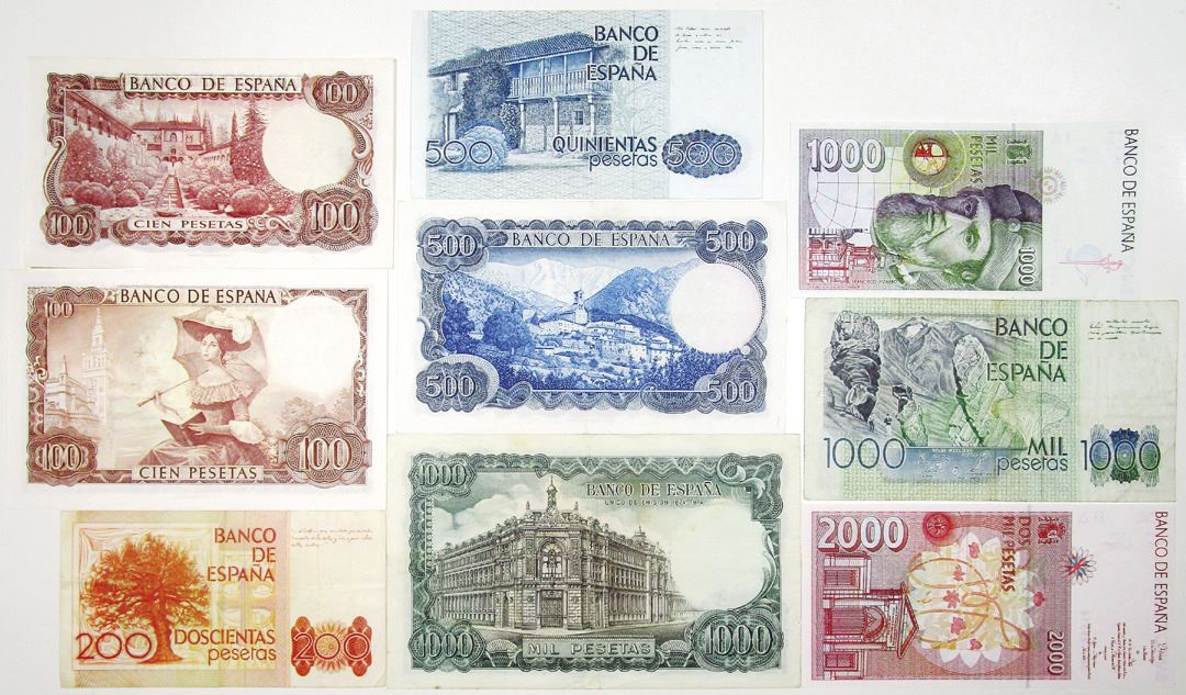 Spain... 1965-1996. 100, 200, 500, 1000, and 1000 Pesetas, P-150; 152a; 153a; 154; 156; 157; 158; 163; 164, issued banknote group, VF to Unc, FNMT (9).