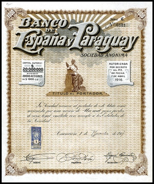 Banco de Espagna Y Paraguay, 1917, Issued Bond. Paraguay, 1,000 Pesos, I/U, Bronze on Cream, Allegorical woman in center. Revenue stamp on lower left, AU