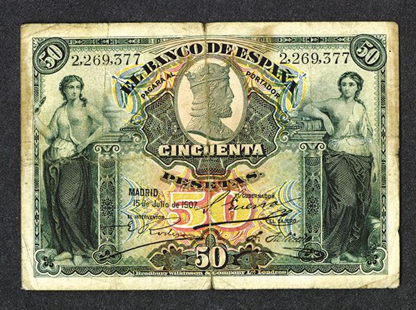 Spain. 50 Pesetas. P-63a. Cathedral of Burgos on back. Very Good. Strong center fold.