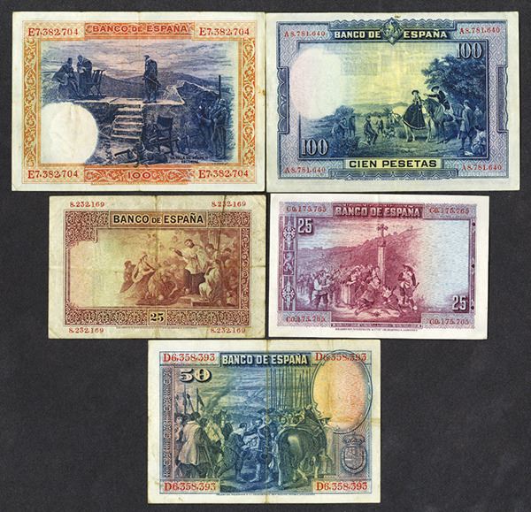 Spain. 25, 50, 100 Pesetas. P-69c; 71a74c(2); 75c; 76a; Mostly Republic issues. Fine to Very Fine. 6 pieces.